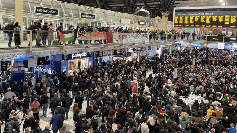 وأظهرت مقاطع مصورة مجموعة كبيرة من المحتجين داخل المحطة خلال ساعة الذروة، وهم يهتفون ويلوحون بأعلام ولافتات مؤيدة للفلسطينيين.