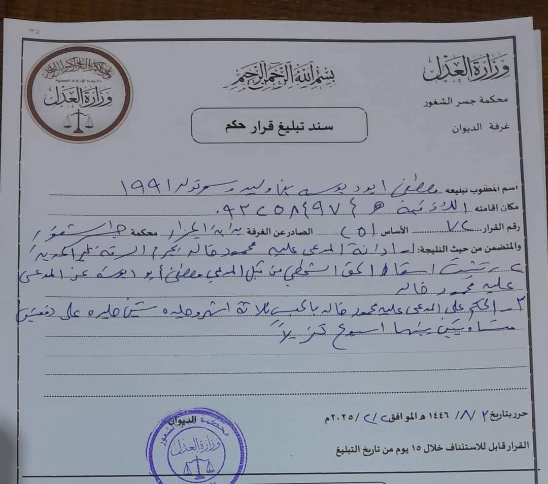محكمة جسر الشغور في إدلب تصدر حكمًا بسجن وجلْد المدعى عليه محمود خالد