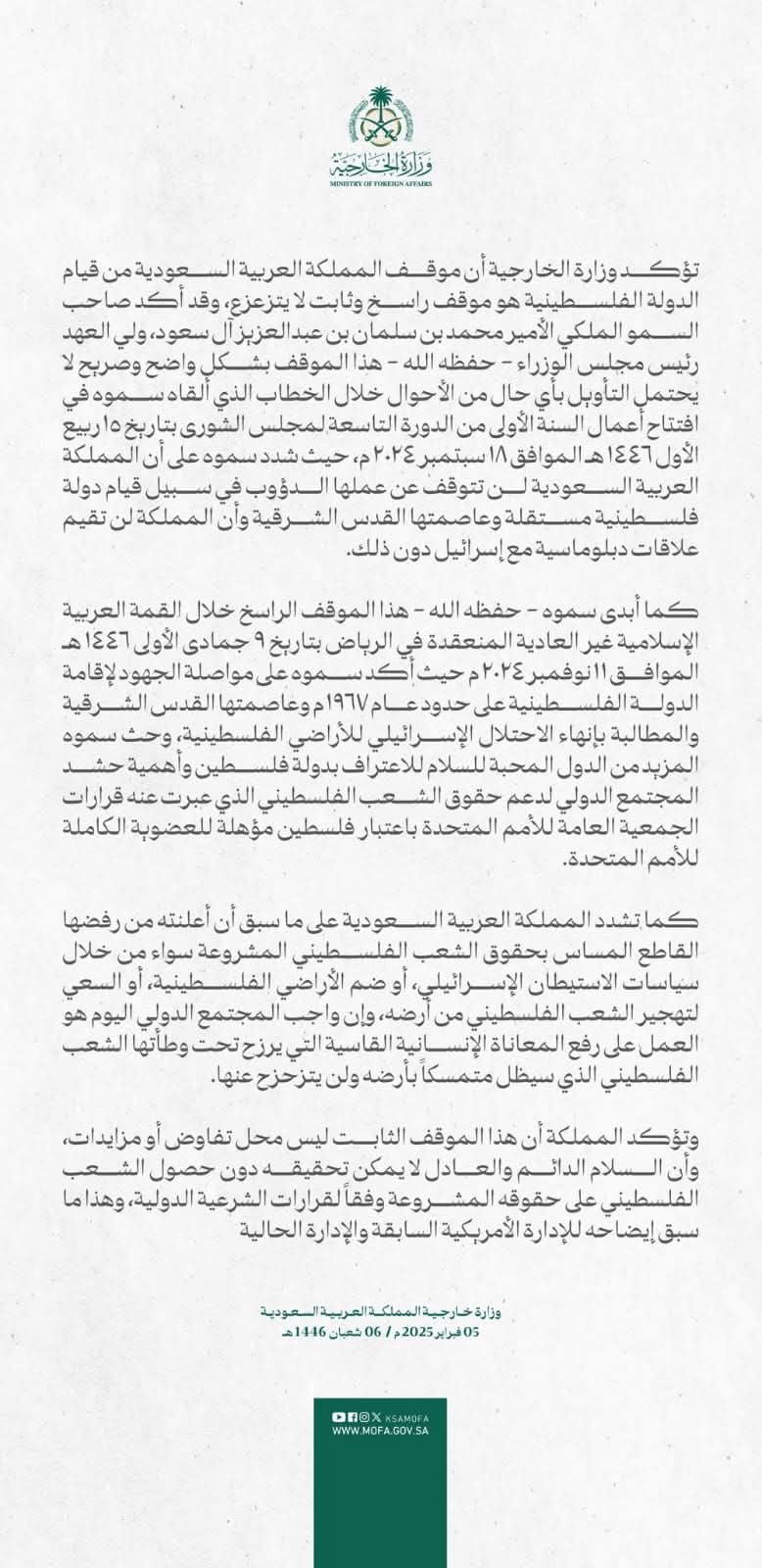 نرصد بالشرح بيان الخارجية السعودية حول قرار ترامب بشأن تهجير الفلسطينيين