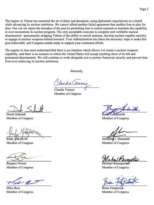 جاء في الرسالة تأكيد على دعم مذكرة الأمن القومي رقم 2 وحملة “الضغط الأقصى“، مؤكدين موقف الإدارة الأمريكية في منع إيران بشكل كامل من الحصول على سلاح نووي.