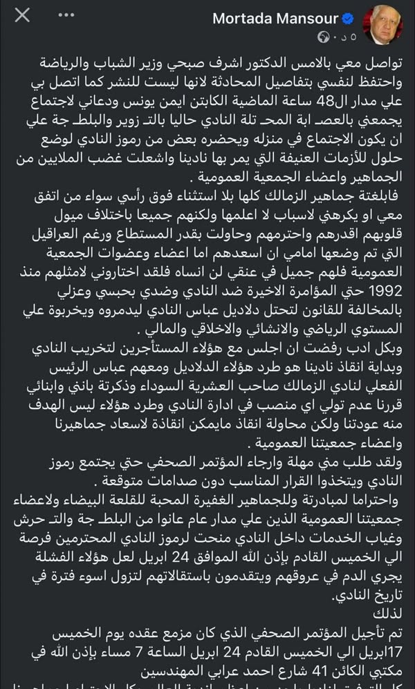 في تطور جديد داخل أروقة نادي الزمالك، أعلن المستشار مرتضى منصور، رئيس النادي السابق، عبر صفحته الرسمية على “فيسبوك”، عن تأجيل مؤتمره الصحفي الذي كان مقررًا عقده يوم الخميس 17 أبريل إلى الخميس المقبل الموافق 24 أبريل، وذلك بناءً على طلب من بعض رموز نادي الزمالك بهدف إعطاء فرصة لحل الأزمة الحالية داخل النادي دون صدامات مباشرة.