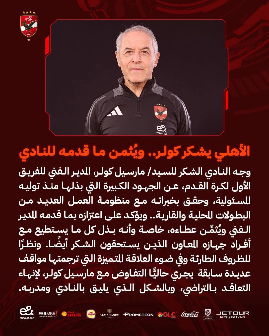 أشار البيان إلى أنه نظراً للظروف الطارئة وفي ضوء العلاقة المتميزة التي ترجمتها مواقف عديدة سابقة، يجري حالياً التفاوض مع مارسيل كولر لإنهاء التعاقد بالتراضي، وبالشكل الذي يليق بالنادي ومدربه.