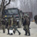 Indian security forces personnel are on manoeuvres as a gunfight with militants has happened that killed 4 soldiers, in South Kashmir's Pulwama district, some 10 km away from the spot of recent suicide bombing, on February 18, 2019. - At least four soldiers died on February 18 in a fierce gunfight with rebels in Indian-administered Kashmir just four days after a suicide bomber killed 41 paramilitaries in the troubled territory, officials said. One soldier and one civilian were also critically wounded in the shootout as troops launched a search operation in Pulwama district where the suicide bomber struck on February 14. (Photo by STR / AFP)