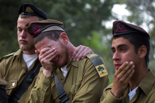 Israeli soldiers from the Golani brigade mourn during the funeral of Sergeant Elichai Taharlev on Mt. Herzl Military Cemetery in Jerusalem, Thursday, April 6, 2017. Taharlev was killed after a Palestinian rammed his vehicle into a group of people in the West Bank on Thursday morning. (AP Photo/Ariel Schalit)
