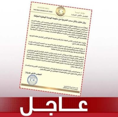 أعلن المجلس الأعلى للدولة في ليبيا، اليوم الجمعة، سحب الشرعية السياسية والقانونية والشعبية من حكومة الوحدة الوطنية برئاسة عبد الحميد الدبيبة، في تطور سياسي حاسم جاء على وقع تصاعد الاحتجاجات الشعبية والمظاهرات الغاضبة التي اجتاحت العاصمة طرابلس وعددًا من المدن الليبية خلال الأيام الماضية.