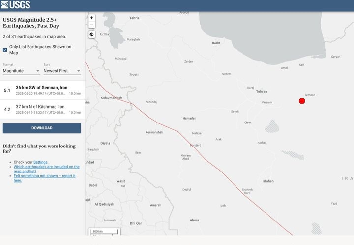 ضرب زلزال بلغت قوته 5.1 درجة على مقياس ريختر، مساء الجمعة 20 يونيو، منطقة قرب مدينة سرخه في محافظة سمنان الإيرانية، وفق ما أعلنته هيئة المسح الجيولوجي الأمريكية.
