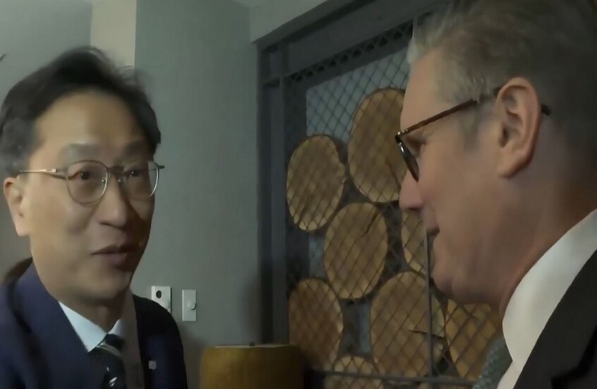 وظهر ستارمر وهو يتحدث إلى مترجم كوري ويصافحه بحرارة بانتظار التقاط الصور البروتوكولية كما تجري العادة عند لقاء الشخصيات الرسمية.