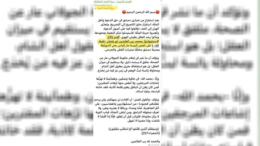 دمشق – تبنى تنظيم “سرايا أنصار السنة” المتطرف الهجوم الانتحاري الذي استهدف كنيسة مار إلياس في دمشق، مهدداً بمزيد من العمليات ضد الأقليات في سوريا وسط تصاعد المخاوف الأمنية في البلاد.