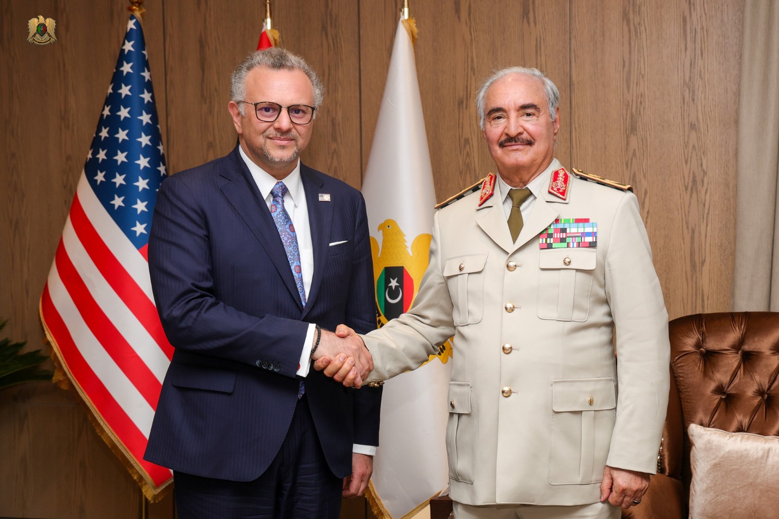 التقى القائد العام للقوات المسلحة الليبية، المشير خليفة حفتر، صباح اليوم في مكتبه بمقر القيادة العامة في الرجمة، مستشار الرئيس الأميركي دونالد ترامب لشؤون أفريقيا والشرق الأوسط، السيد مسعد بوليس، والوفد المرافق له.