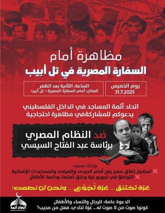 دعا الشيخ مشهور فواز، رئيس المجلس الإسلامي للإفتاء في إسرائيل وعضو الاتحاد العالمي لعلماء المسلمين التابع لجماعة الإخوان المسلمين، إلى المشاركة الواسعة في التظاهرة المقررة يوم الخميس المقبل أمام السفارة المصرية في تل أبيب، تضامنًا مع قطاع غزة، الذي يشهد أوضاعًا إنسانية صعبة في ظل التصعيد الأخير.