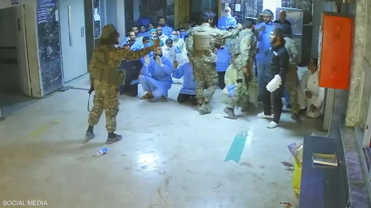 ويظهر الفيديو، الذي نقله المرصد السوري لحقوق الإنسان، عشرات الأشخاص الذين يرتدون زي العمل داخل المسشفى، جاثمين على ركبهم.