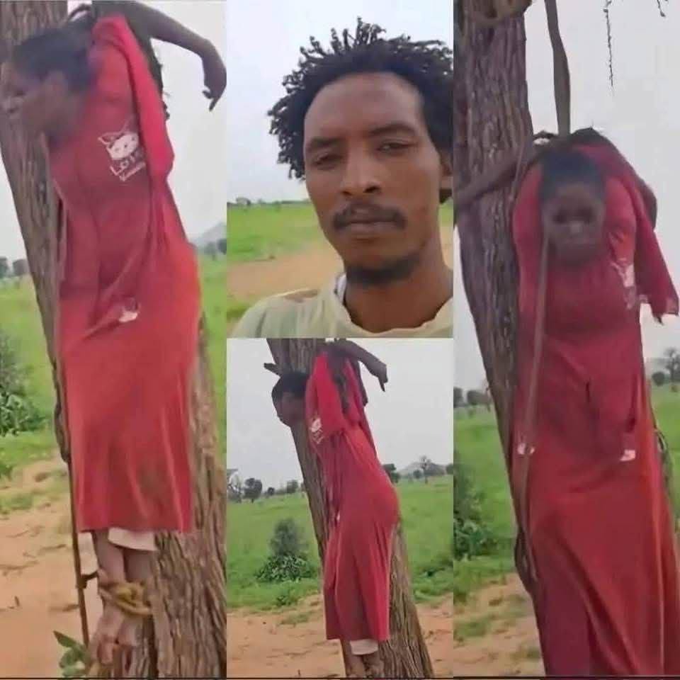 في مشهد صادم هز الضمائر السودانية، اقدم قيادي قي الدعم السريع على تعليق فتاة سودانية تدعى قسمة عل عمر من إقليم كردفان وتعمل “مزارعة” على شجرة باستخدام حبال لساعات طويلة، مع توثيق الفعلة بالصور والفيديو في حى قرى الضعين، غرب دارفور.