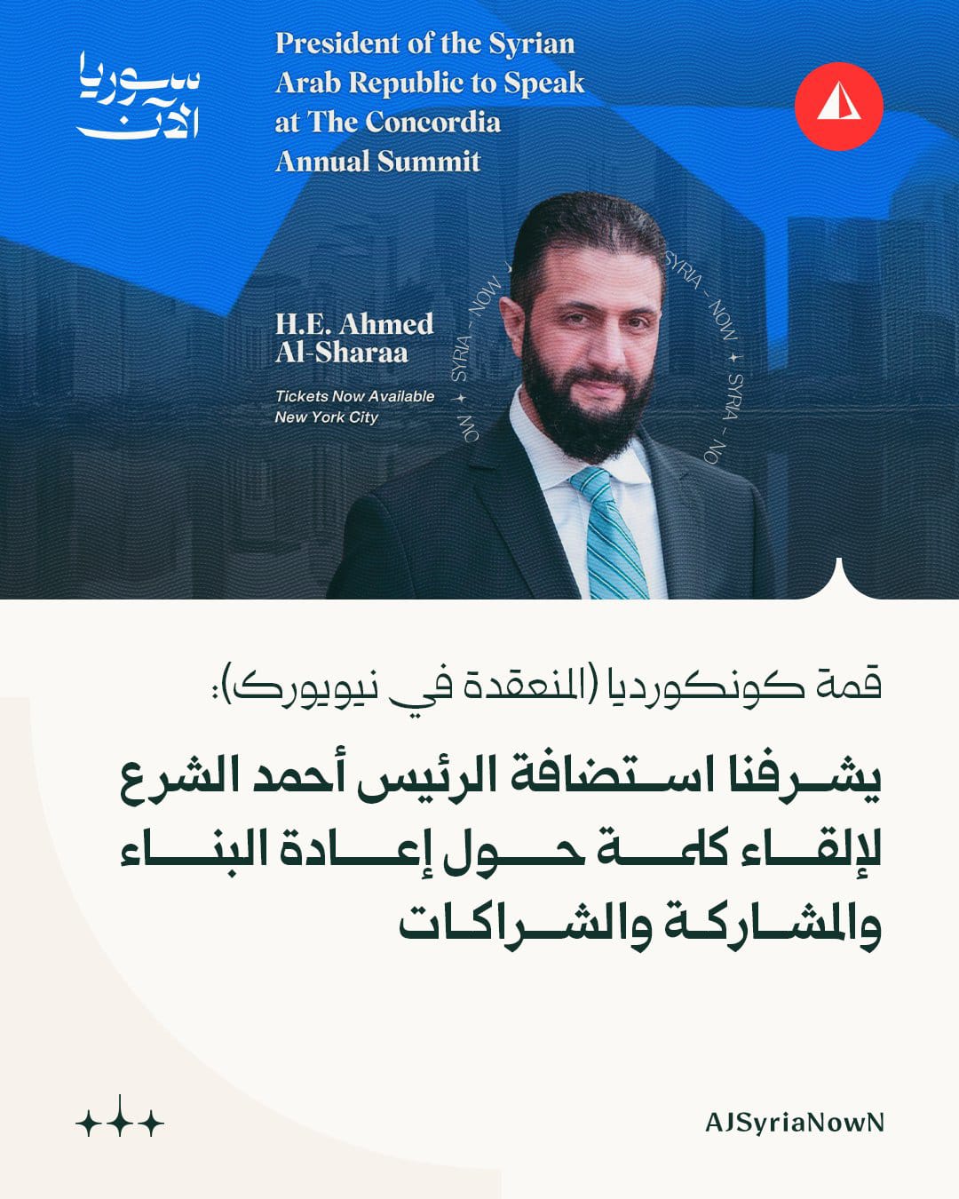 مقابل 2000 دولار: أحمد الشرع سشارك بقمة كونكورديا 2025 في نيويورك 2025