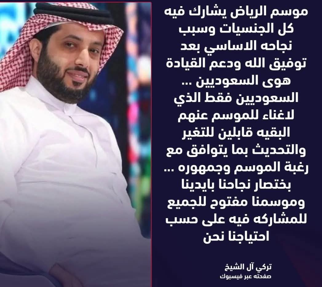 .تصريحات تركي آل الشيخ: شكر للسعوديين ورد على التفاعلأعلن تركي آل الشيخ، رئيس الهيئة العامة للترفيه، في أكثر من منشور رسمي وتصريح إعلامي أنّ موسم الرياض يرحّب بمشاركة جميع الجنسيات العالمية في برنامجه الغني بالفعاليات، لكنه نسب الفضل في نجاح كل هذه الإنجازات للسعوديين فقط بعد توفيق الله ودعم القيادة السعودية، مؤكدًا أن السعوديين هم “الذين لا غناء للموسم عنهم”