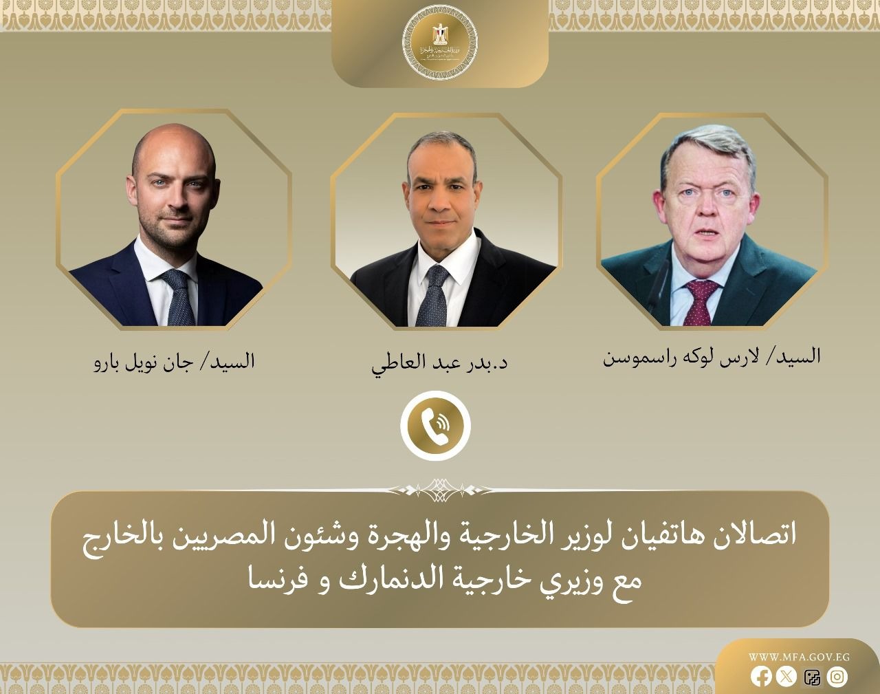 أجرى الدكتور بدر عبد العاطي، وزير الخارجية والهجرة وشئون المصريين بالخارج، اتصالين هاتفيين مع كل من السيد جان نويل بارو، وزير خارجية فرنسا، والسيد لارس لوكه راسموسن، وزير خارجية الدنمارك، وذلك في إطار متابعة التطورات المتسارعة في قطاع غزة، وبحث سبل دعم الأمن والاستقرار في المنطقة.