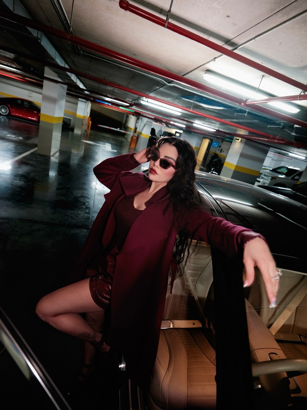 نشرت هيفاء مجموعة صور من جلسة تصوير جديدة ظهرت فيها بإطلالة مونوكروم جريئة باللون البرغندي الملكي، شملت سروالًا قصيرًا جدًا بقصّة خصر عالية من الجلد، توب مكشوف الكتفين ومعطف طويل مضاد للمطر.