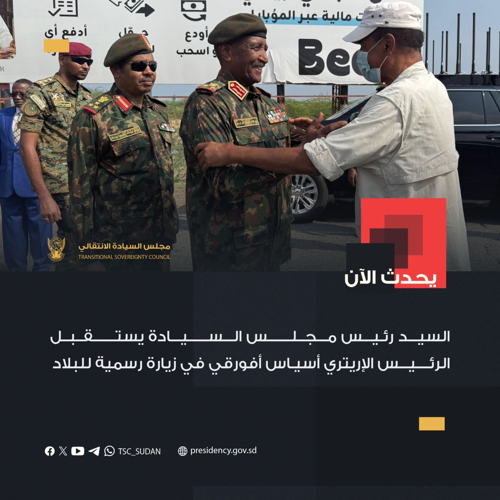 وكان في استقبال أفورقي على رأس وفد رفيع المستوى في مطار بورتسودان، رئيس مجلس السيادة السوداني والقائد العام للقوات المسلحة، الفريق أول عبد الفتاح البرهان.