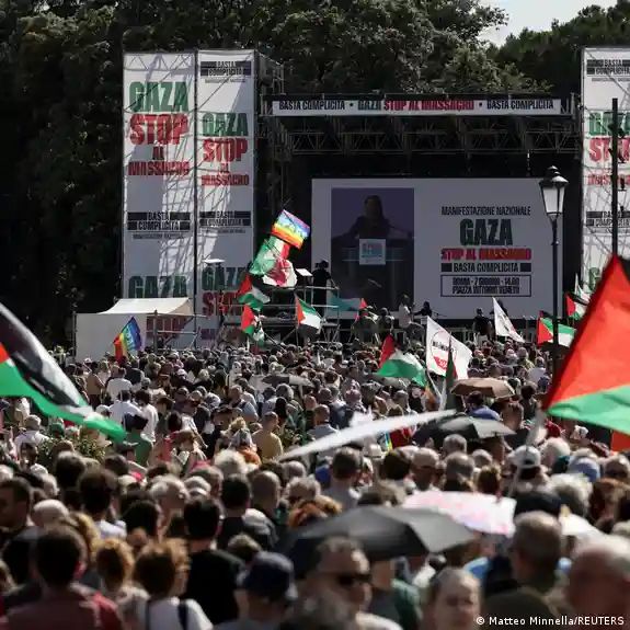 كما تضمنت الشعارات والملصقات التي رفعها المشاركون عبارات مثل: “كفى إبادة في غزة”، وصور لرئيسة الحكومة جورجيا ميلوني ووزراء آخرين بينهم ماتيو سالفيني وأنتونيو تاجاني وكروزيتو نفسه، مصحوبة بعبارة: “متواطئون في الإبادة الجماعية”.