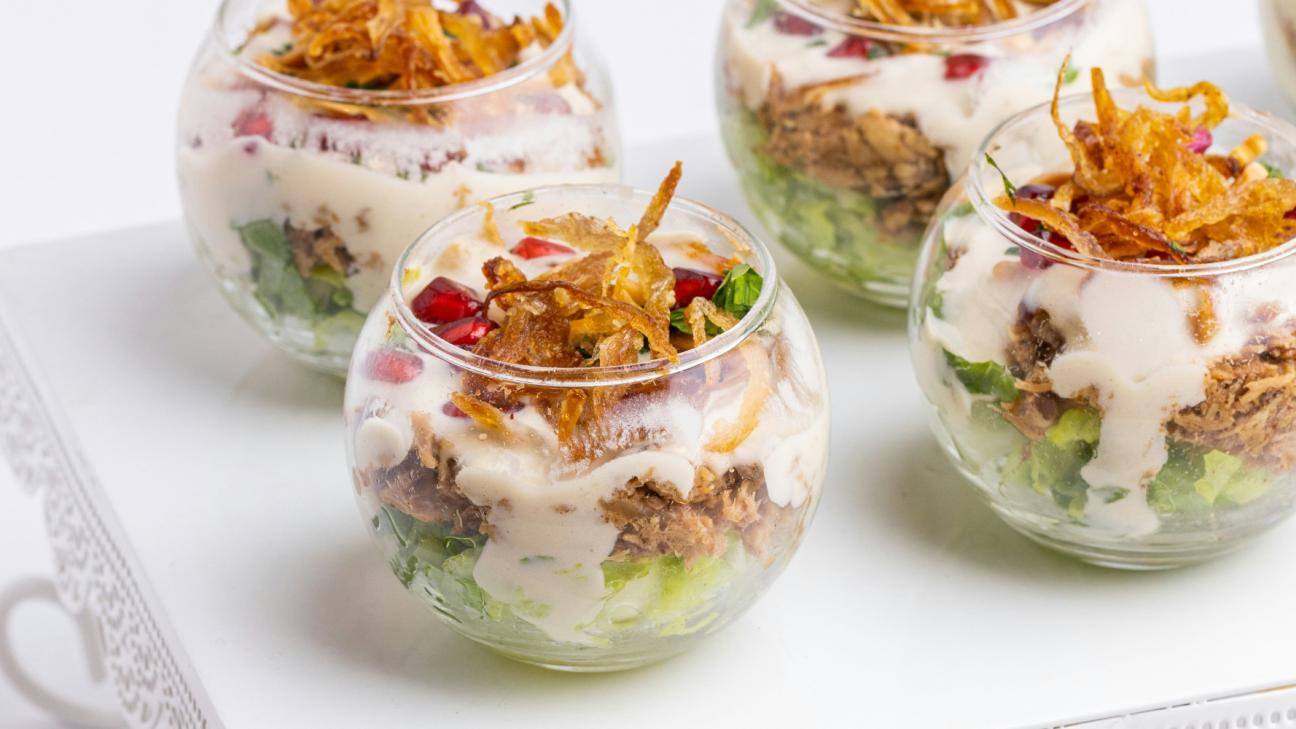 نقترح عليك سلطة طازجة وخفيفة ومميزة، تتميز بسهولة التحضير وتُضفي لمسة احتفالية خاصة. يمكن تقديمها في أوعية فردية لزيادة اللمسة الجمالية على المائدة.