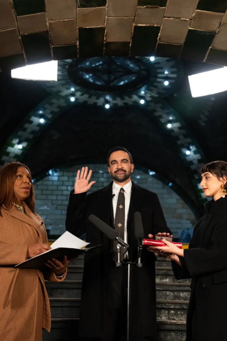 واختار ممداني أداء القسم في محطة مترو تاريخية تحت مبنى البلدية في مانهاتن، والتي شيدت خلال فترة ازدهار المدينة وافتتحت عام 1904 قبل أن تُغلق عام 1945، معتبراً هذا الاختيار رمزاً لبداية “عصر جديد” للمدينة. وترأست مراسم أداء اليمين المدعية العامة لولاية نيويورك، ليتيشا جيمس، في حدث قصير حضره عدد محدود من المسؤولين.