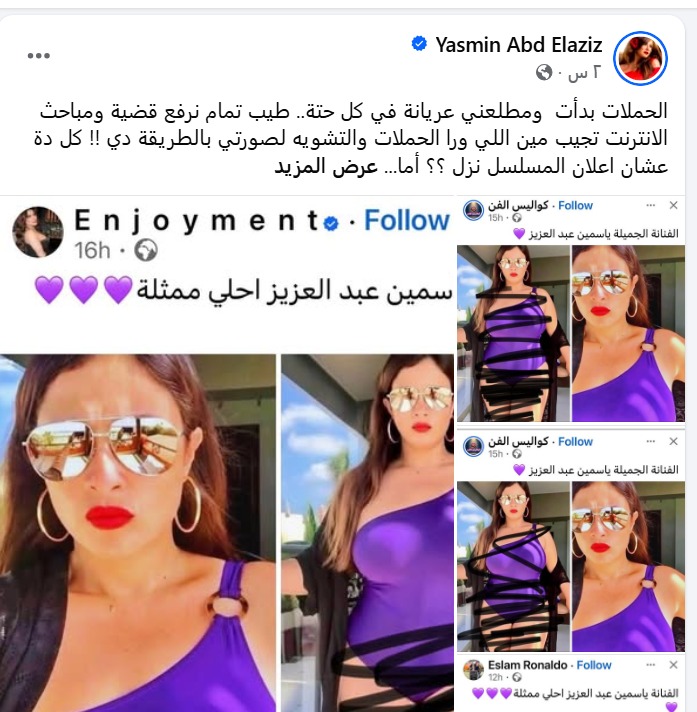 وأكدت ياسمين عبد العزيز أن هذه الحملة تهدف إلى النيل من سمعتها وتشويه صورتها أمام جمهورها تزامنا مع نجاح برومو المسلسل الذي يشاركها بطولته الفنان كريم فهمي.