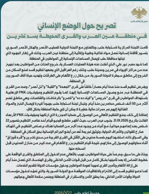 أصدرت مديرية إعلام حلب في سوريا بيانًا عاجلًا مساء الثلاثاء، سلطت فيه الضوء على الوضع الإنساني الحرج في منطقة عين العرب والقرى المحيطة بسد تشرين، وسط استمرار الحصار وتهديد حياة المدنيين بسبب الألغام والعنف المسلح.