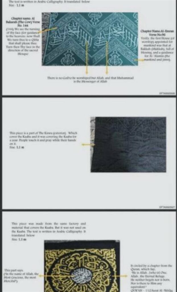 وفقا للفواتير والوثائق المسربة، تم تصنيف الشحنة تحت بند “أعمال فنية من السعودية” (Artwork from Saudi Arabia)، وحملت توصيفات دقيقة مثل “KISWA – INNER” (الكسوة الداخلية) و”KISWA – OUTER” (الكسوة الخارجية).