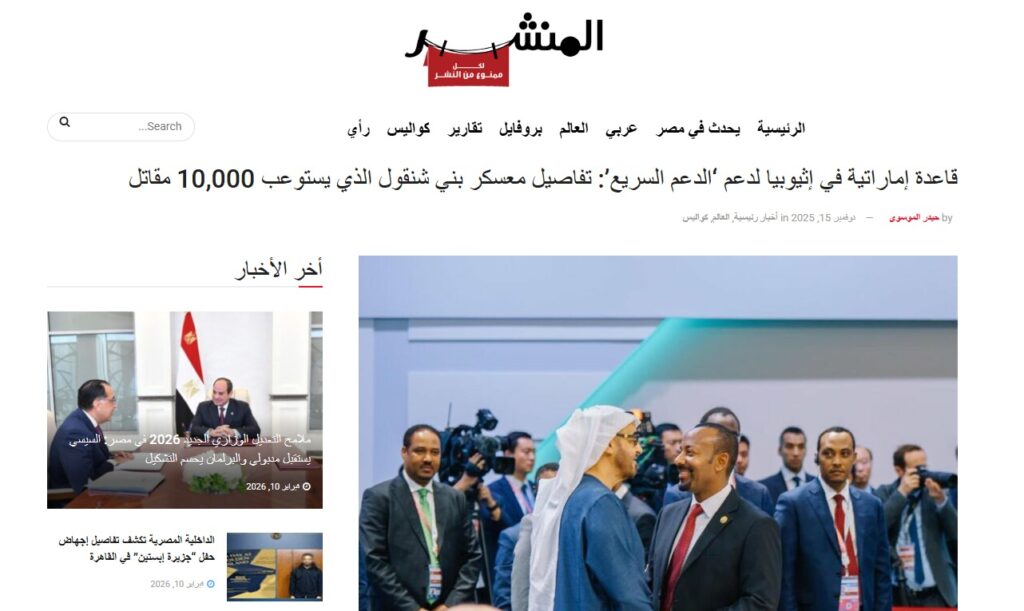 أديس أبابا – المنشر الإخباري، 10 فبراير 2025، في تأكيد جديد على دقة ومصداقية التحقيقات التي ينشرها “المنشر الاخباري”، كشف تقرير موسع لوكالة رويترز اليوم عن قيام دولة الإمارات العربية المتحدة بإنشاء معسكر عسكري سري في إقليم “بني شنقول” بإثيوبيا، مخصص لتدريب آلاف المقاتلين لدعم ميليشيا قوات الدعم السريع في السودان؛ وهو ذات المخطط الذي انفرد “المنشر الإخباري” بكشف تفاصيله وموقعه الدقيق منذ نوفمبر 2025.