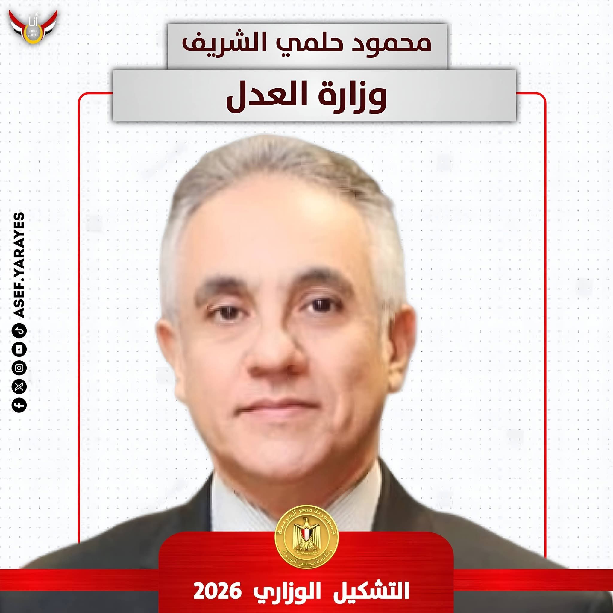 المستشار محمود حلمي الشريف هو وزير العدل المصري الجديد في التعديل الوزاري لعام 2026، بعد موافقة مجلس النواب على تعيينه ضمن حكومة الدكتور مصطفى مدبولي المعدَّلة.