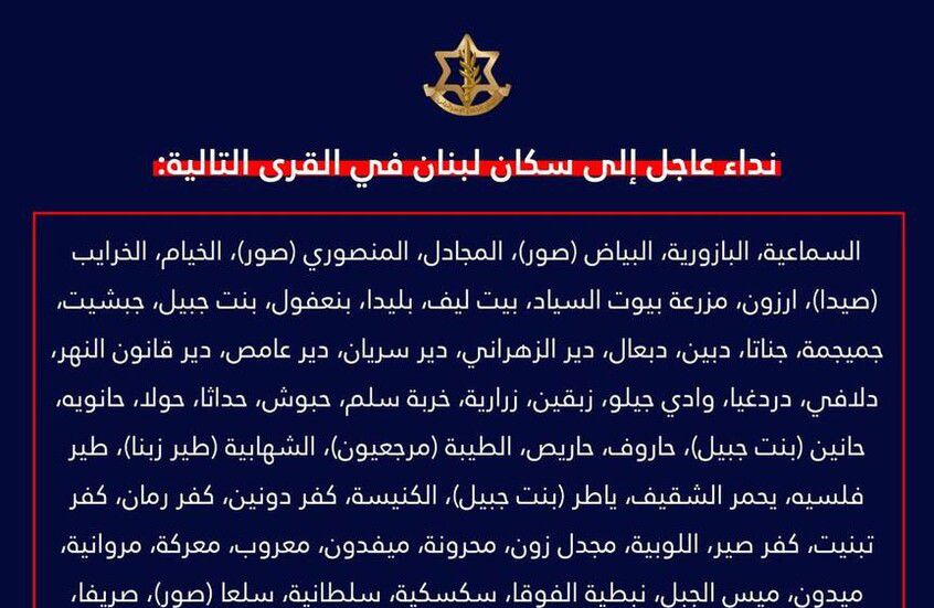 الجيش الإسرائيلي يفرض إخلاء 80 قرية ويشدّد على الابتعاد عن مناطق حزب الله لمواجهة التصعيد العسكرى