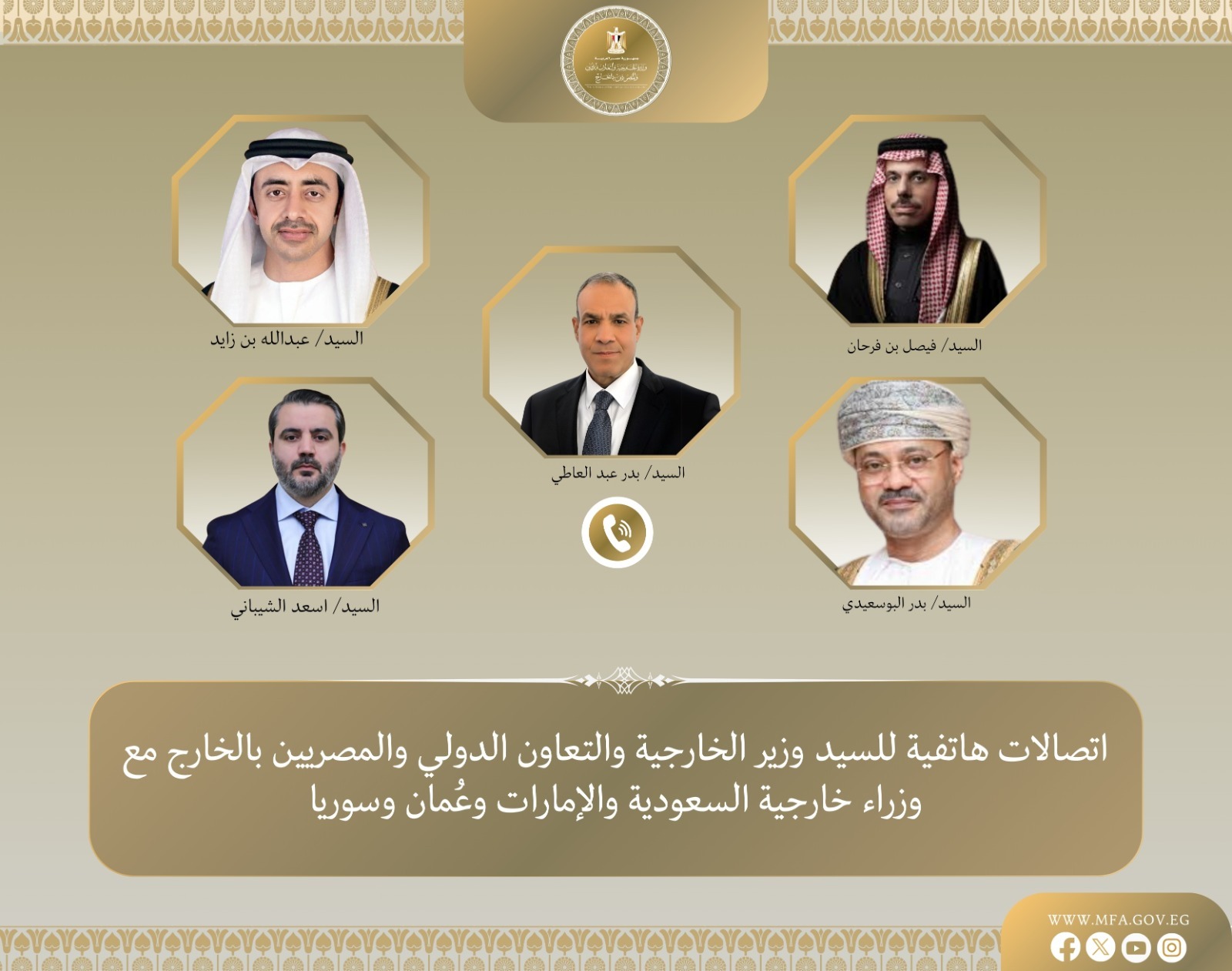 أجرى وزير الخارجية والهجرة وشؤون المصريين بالخارج، الدكتور بدر عبد العاطي، سلسلة من الاتصالات الهاتفية المكثفة شملت وزراء خارجية كل من: المملكة العربية السعودية، ودولة الإمارات العربية المتحدة، وسلطنة عمان، والجمهورية العربية السورية. وتأتي هذه التحركات في توقيت بالغ الحساسية، حيث تواجه المنطقة مخاطر الانزلاق نحو صراع إقليمي شامل قد يعصف باستقرارها لعقود.