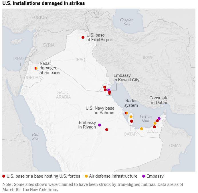 وذكرت صحيفة نيويورك تايمز أن إيران ردت على الهجوم الأمريكي الإسرائيلي عبر إطلاق صواريخ وطائرات مسيّرة استهدفت قواعد ومنشآت عسكرية أمريكية، إضافة إلى مرافق دبلوماسية وبنى تحتية مرتبطة بأنظمة الدفاع الجوي.