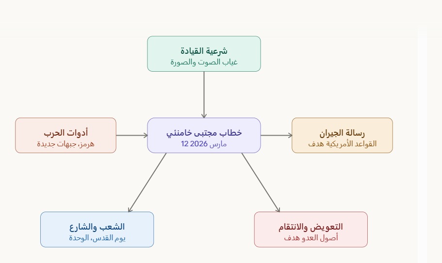 فالخطاب لم يوجه لجمهور واحد، بل لجمهورات متعددة في آن معا، للشعب الإيراني دعوة للوحدة والتماسك، وتذكير بيوم القدس كفعل تعبوي، وإشارة إلى تعويض المتضررين من الحرب. هذا خطاب داخلي يستهدف احتواء التذمر الشعبي من الحرب ومن التوريث القيادي.