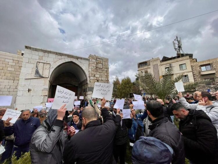 تحت شعار “لسنا لاجئين.. نحن أبناء الأرض”، شهد حي باب توما التاريخي في قلب العاصمة السورية دمشق، ظهر اليوم الأحد 22 مارس 2026، وقفة احتجاجية حاشدة شارك فيها مئات المواطنين من المسلمين والمسيحيين.