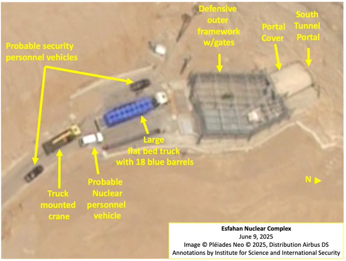 وتظهر الصور قافلة تضم شاحنة بطول 13 مترا محملة بـ 18 برميلا أزرق اللون، متوقفة عند مدخل مجمع الأنفاق المحصن الذي بني عام 2004 لحماية المواد النووية من الضربات الجوية والتهديدات الخارجية.