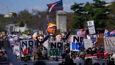 وفي العاصمة واشنطن، احتشد آلاف المحتجين في ساحة ناشونال مول، حاملين لافتات هددوا فيها بسياسات ترامب ورفعوا شعارات مؤيدة للديمقراطيين، في حين عبر آخرون عن رفضهم القاطع للهجمات العسكرية الأمريكية والإسرائيلية على إيران.