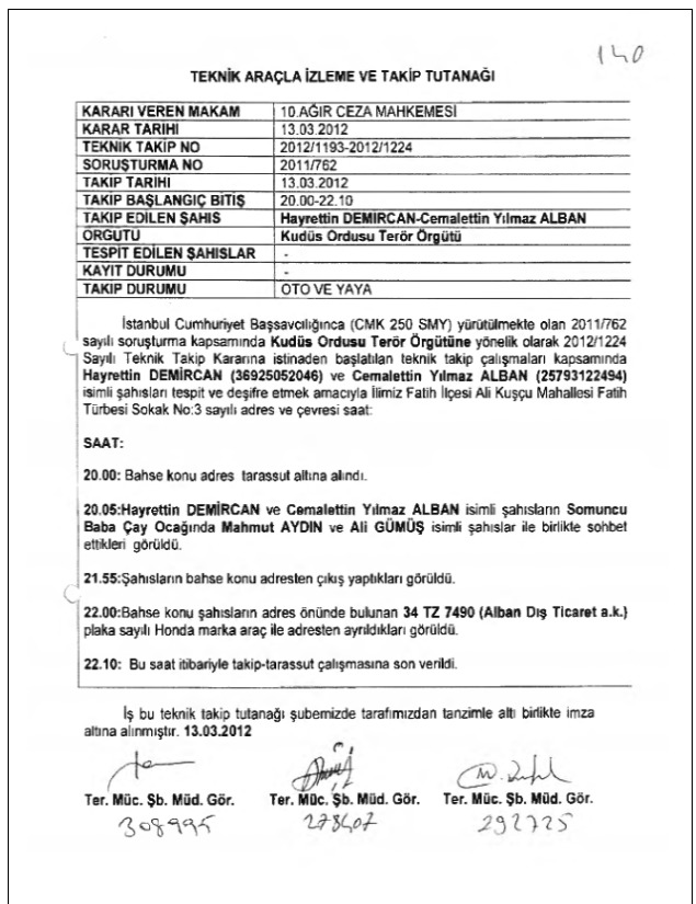 بناء على أوامر قضائية صدرت في ديسمبر 2011، وضعت الشرطة التركية دميرجان تحت المراقبة اللصيقة والتنصت الهاتفي. ووثقت تقارير المراقبة، المدعومة بالصور الفوتوغرافية، اجتماعات متكررة لدميرجان مع عناصر من فيلق القدس في مقهى “سومونكوبابا” بحي الفاتح المحافظ في إسطنبول.