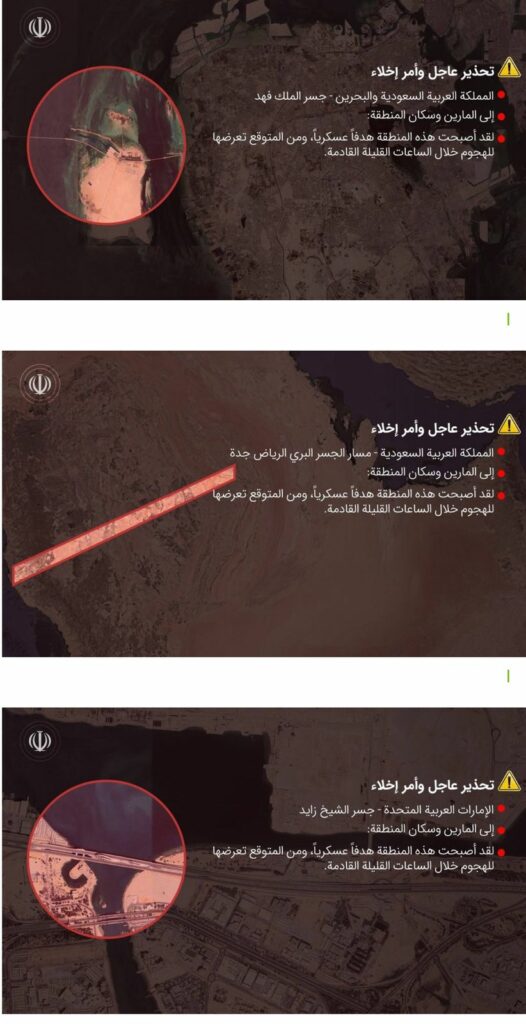 أصدر الحرس الثوري الإيراني، مساء الثلاثاء، تحذيراً أمنياً عاجلاً إلى كل من المملكة العربية السعودية والإمارات والبحرين، مشدداً على أن هذه التحذيرات تأتي في إطار ما وصفه بـ”ضرورة حماية المدنيين وضمان سلامة الممرات الاستراتيجية”. وأكد الحرس الثوري أن التحذيرات تشمل مجموعة من الجسور والممرات البرية المهمة، وأنها ستُصنّف كمناطق عسكرية مغلقة ابتداءً من الساعة 23:00 بتوقيت طهران، وحتى إشعار آخر، داعياً الجميع إلى مغادرة المناطق المعنية على الفور والامتناع عن أي تنقل فيها.