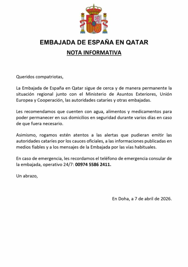 في مؤشر جديد على تصاعد حالة القلق الإقليمي مع اقتراب “ساعة الصفر”، أصدرت السفارة الإسبانية في قطر، مساء الثلاثاء 7 أبريل 2026، بيانا عاجلا تضمن نصائح استثنائية لرعاياها المقيمين في الدولة الخليجية، تحثهم فيها على اتخاذ تدابير احترازية فورية تضمن قدرتهم على البقاء في المنازل في حال وقوع أي طارئ.