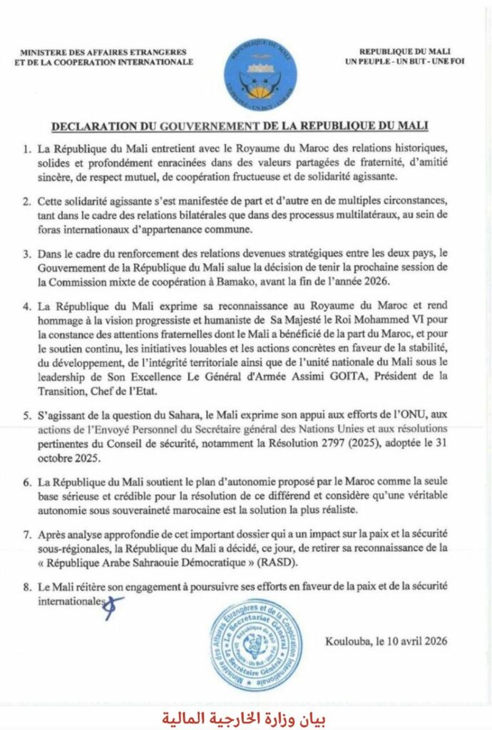 في خطوة دبلوماسية وُصفت بأنها من أبرز التحولات السياسية في منطقة الساحل الإفريقي خلال الفترة الأخيرة، أعلنت جمهورية مالي سحب اعترافها بما يُعرف بـ”الجمهورية العربية الصحراوية الديمقراطية”، مع إعلان دعمها لمبادرة الحكم الذاتي التي تقدم بها المغرب كحل لنزاع الصحراء.