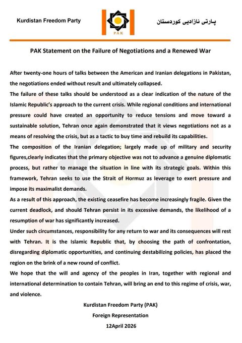 أصدر حزب حرية كردستان (PAK) بيانا تحليليا مفصلا تعليقا على فشل المفاوضات الرفيعة التي استضافتها العاصمة الباكستانية إسلام آباد بين الوفدين الأمريكي والإيراني، محذرا من أن النهج المتعنت لإيران وضع المنطقة بأسرها على فوهة بركان، بعد انقضاء واحد وعشرين ساعة من المباحثات المكثفة التي انتهت دون نتائج تذكر.
