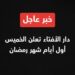وقالت الوزارة إن “الخميس 19 فبراير 2026 يُعتبر اليوم الأول من رمضان”، داعية المواطنين والمقيمين إلى الاستعداد للصيام والعبادة.